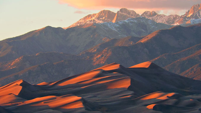 Песчаные дюны, самые высокие в Северной Америке и достигающие 750 футов (229 м), представляют разительный контраст с заснеженным горным хребтом Sangre de Cristo Mountains с высотами от 7515 футов (2291м) до 13604 футов (4146м). И если температура дюн достигает 140F, то в то же самое время температура в горах не поднимается выше 35-40F. До сих пор ученые не могут определить, как и когда появились дюны. Есть несколько гипотез, но ни одна из них не дает ясного представления об этом. Ориентировочно дюны начали формироваться 440 тыс лет назад.