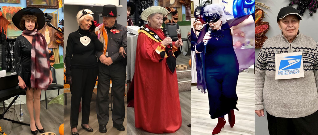 Музыкальный руководитель Центра в Вилинге Диана Коффман — в образе элегантной ведьмы. С улыбкой и блеском в глазах она превращает каждую репетицию в маленькое чудо, а любой концерт — в праздник души. Фото: Л. Бел; Кот и чёрт — Оля Милешкевич и Захар Гимельман, словно сошедшие со страниц «Мастера и Маргариты». Остроумная пара, в чьём взгляде и улыбке — весь дух волшебного Хэллоуина. Фото: Л. Бел; На сцене царит праздничное волшебство: София Мень — в образе Кровавой Мэри с бокалом «зелья», музыкальный директор Диана Коффман держит зал под чарами фортепиано, а Любовь Бел (справа), вдохновитель культурных программ Forever Young, ведёт программу с фирменным блеском и юмором. За кулисами Алекс Жировецкий колдует над звуком — чтобы ни одна ведьма не сбилась с ритма. Фото: Л. Бел; Ольга Чумак сразила публику своим ярким выступлением на Хэллоуинском концерте Forever Young — в маске, с микрофоном и лёгким театральным шиком. Рядом — Лариса Тургель, директор культурно-просветительных программ, элегантная «чёрная кошка», ловко направляющая ход концерта. Фото: Л. Тургель; Надежда Писарева в костюме почтальона — с эмблемой United States Postal Service и стихотворением собственного сочинения. На Хэллоуин она напомнила всем, что добрые вести и улыбки тоже можно доставлять по адресу. Фото: Л. Бел