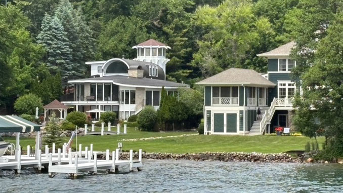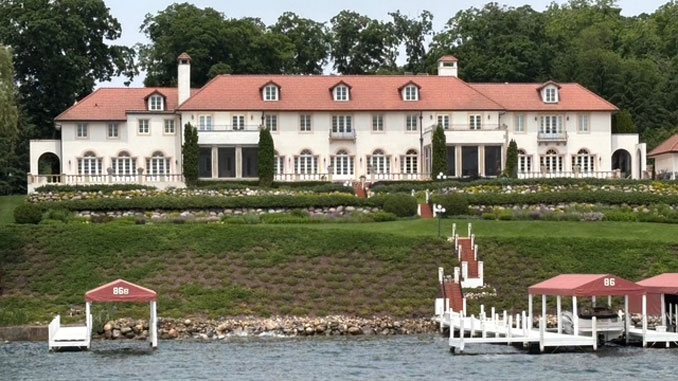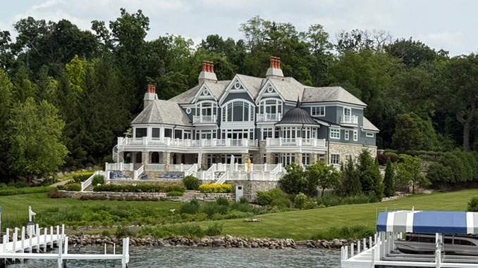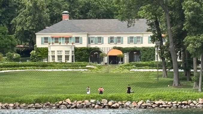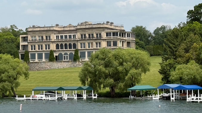 - Stone Manor — самый большой особняк на озере, построенный в 1899 году для Отто Янга. 50 комнат, семь уровней, роскошные интерьеры, витражи, лепнина — настоящее архитектурное заявление о статусе.