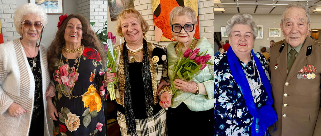 Оля Михалкова (слева) и Галина Халилова — в компании, где дружба цветёт, как гвоздики в руках, а каждый день наполнен теплом и взаимностью; Лиля «Ляля» Сорока (слева) и Светлана Пастернак — с букетами весенних тюльпанов и сердцами, открытыми к новым встречам. В Центре они нашли не только тёплую атмосферу, но и дружбу, которая, как и любовь, не знает границ; Тамара Голенко (слева) и Ефим Цыбульский, капитан артиллерийских войск, — два человека, чьи судьбы пересеклись уже на новой земле. Их дружба — ещё одно напоминание о том, что уважение, тепло и человеческая связь не знают границ. Фото: В. Крупейченко.