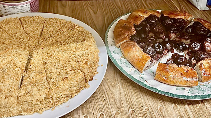 Конечно, главным героем дня был не учебник, а стол. На нём выстроились круги радости: вишнёвый, яблочный, творожный, лимонный. Один пирог был испечён дома, другой принесён в коробке, третий – куплен по дороге, «потому что он такой, как у мамы был». Мы резали их, пробовали, делились, обсуждали, смеялись. И всё это – под музыку 50-х, под ритмы юности, с ароматом свежезаваренного чая.