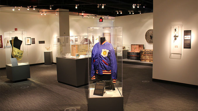Перечислю и другие разнообразные экспонаты выставки: лоскутные одеяла, столовые скатерти, старинные швейные машины, наперстки, плетёный коврик, фартук, который носила работница местной фабрики, баннеры, форму девочки-скаута и коллекцию лент с местных ярмарок. Моё внимание привлекла фотография нарядных девочек, одетых для выпускного бала, в одной из местных школ более полувека назад — интересная была мода! Дочка надолго задержалась у витрин с детскими и подростковыми платьями, читала истории, связанные с ними, и выбирала то, которое с удовольствием надела бы и сейчас.
