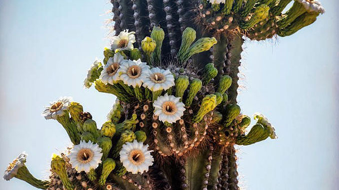 Необыкновенно красиво цветение кактусов весной. Это продолжается с апреля по июнь. Большие цветы сотнями распускаются на растении на закате дня с надвигающейся прохладой, но уже к следующему полудню они никнут и опускаются, чтобы снова ожить к закату. И так повторяется изо дня в день. Множество насекомых и птиц слетаются к цветам, опыляя их. Белокрылые голуби и летучие мыши, мотыльки и пчелы питаются нектаром цветов кактуса и разносят пыльцу по окрестностям.