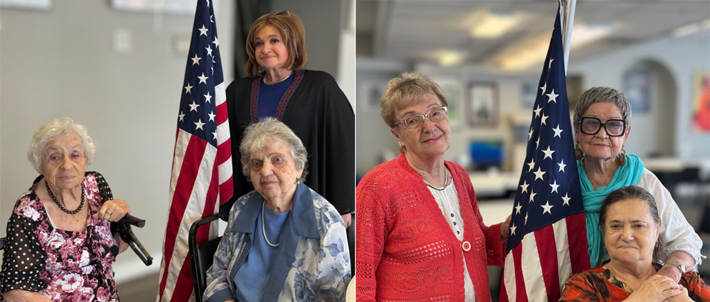 (Слева направо) Рая Каган, получившая гражданство США в 1991 году, Лиля Швейдель — гражданка с начала 90-х, и Виктория Вульфсон, директор культурно-просветительных программ Центра Forever Young в Линкольнвуде, ставшая гражданкой почти 40 лет назад, — отмечают День независимости рядом с флагом страны, ставшей их домом; (Слева направо) Анна Ратнер и Светлана Пастернак, получившие гражданство США в 2003 году, и Сара Борискина, ставшая гражданкой в 1998-м, отмечают День независимости в Центре Forever Young. Фото: Л. Литас